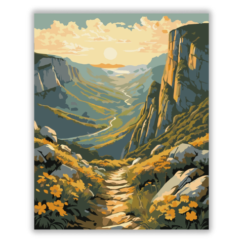Serra do Cipó Hegység Napfelkeltében - számfestő készlet – 40×50 cm (Keret nélkül) A festmény a Serra do Cipó hegységet ábrázolja napfelkeltekor, ahol a sziklás szirtek aranyló fényben fürdenek, és vadvirágok nyílnak az ösvény mentén. Az élénk sárgák és z