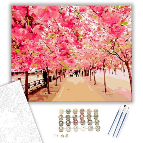 Sétáló utca - számfestő készlet – 40×50 cm (Keretre feszítve) A kép egy nyugodt sétára invitál, ahol a tavaszi virágok élénk színei életre kelnek. A járókelők csendes pillanatai megelevenednek a festményen, mintha egy történetet mesélnének el. A rózsaszín