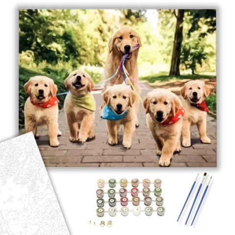 Sétáltatás - számfestő készlet – 40×50 cm (Keretre feszítve) A festmény vidám és játékos hangulatot áraszt, mintha egy boldog séta pillanatát örökítené meg. Egy történet bontakozik ki, ahol a természet és az ártatlan játékosság találkozik. A zöldellő hátt