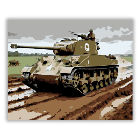 Sherman Tank Csata Közben - számfestő készlet – 40×50 cm (Keret nélkül) A festmény egy Sherman tankot ábrázol, amely egy sáros mezőn halad előre, miközben katonák kísérik. A színek zöld és barna árnyalatai a harctéri körülményeket és a tank robusztus megj