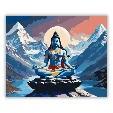 Shiva Meditáció a Himalájában - számfestő készlet – 40×50 cm (Keret nélkül) A festmény Shiva istent ábrázolja meditáció közben a Himalája hegycsúcsai között, holdfénnyel és a Gangesz forrásával. A képen a hideg kék és meleg narancs színek harmonikus kontr