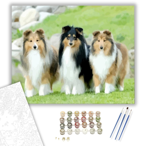Skót juhászok - számfestő készlet – 40×50 cm (Keretre feszítve) Ez a festmény a hűség és barátság meghitt pillanatait ragadja meg, egy idilli tájban. A három skót juhász egy történetet mesél el, ahol a természet és az állatok harmóniája válik kézzelfoghat