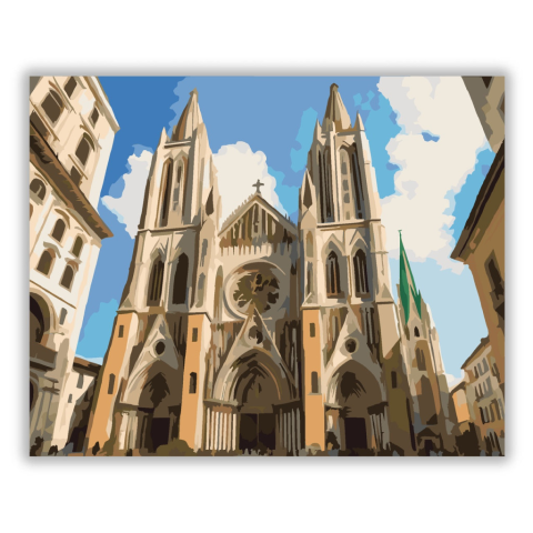 São Paulo Katedrális Gótikus Tornyai - számfestő készlet – 40×50 cm (Keret nélkül) A festmény a São Paulo Katedrálist ábrázolja, jellegzetes zöld tornyaival és gótikus részleteivel. A kép világos, napfényes színei kiemelik a katedrális grandiózus építésze