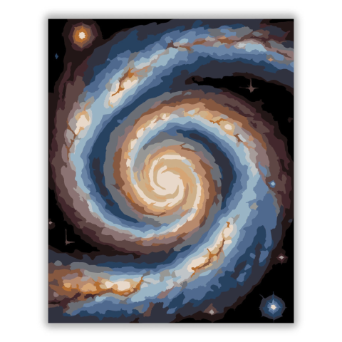 Spirálgalaxis Csillagokkal - számfestő készlet – 40×50 cm (Keret nélkül) A festmény egy lenyűgöző spirálgalaxist ábrázol, amelynek örvénylő karjai csillagokkal és csillagködökkel tarkítottak. A kép domináns színei a kék és arany árnyalatok, amelyek fenség