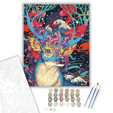 Szarvas és Halak - számfestő készlet – 40×50 cm (Keretre feszítve) Ez a vibráló festmény egy varázslatos világba kalauzol, ahol a természet és az álmok találkoznak. A jelenet misztikus történetet mesél el, ahol a szarvas és a halak különös harmóniában éln
