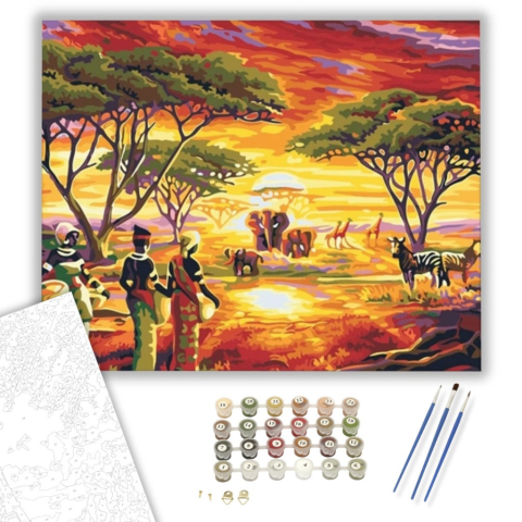 Szavannai Állatok - számfestő készlet – 40×50 cm (Keretre feszítve) A festmény meleg, vibráló színei az afrikai szavanna varázslatos naplementéjét idézik, amely elbűvöli a nézőt. A háttérben kirajzolódó alakok és állatok egy titokzatos történetet mesélnek