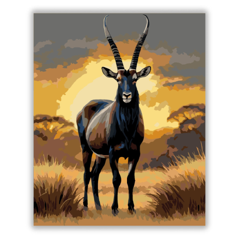 Szavannai Szablya Antilop - számfestő készlet – 40×50 cm (Keret nélkül) A festmény egy szablya antilopot ábrázol, amint büszkén áll a magas fűben, fekete szarvai ívesen hajlanak feje fölé. A sötét, fényes szőrzet kontrasztban áll az aranyló szavanna színe