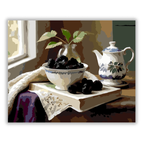Szeder Csésze és Teáskanna - számfestő készlet – 40×50 cm (Keret nélkül) A festmény egy porcelán csészében elhelyezett fénylő szedreket ábrázol, egy régi könyv mellett, egy gőzölgő teáscsészével. A mély lila és zöld árnyalatok nyugalmat és eleganciát sugá