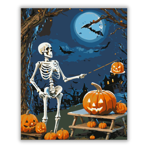 Szellemes Őszi Vigyázó - számfestő készlet – 40×50 cm (Keret nélkül) Fedezd fel ezt a lenyűgöző 'Szellemes Őszi Vigyázó' számfestő készletet, ahol egy csontváz viccesen mutatja meg az őszi időszak játékos oldalát. Az élettelen társaság és a fáklyafényes t