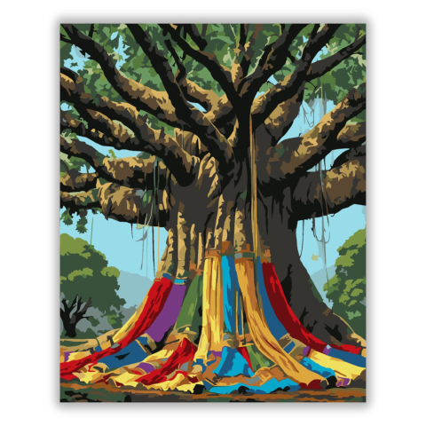 Szent Banyanfa Színes Szövetekkel - számfestő készlet – 40×50 cm (Keret nélkül) A festmény egy szent banyanfát ábrázol, amelyet színes szövetekkel és imaszálakkal díszítettek, miközben áldozatok vannak elhelyezve a gyökereinél. A vibráló piros, kék, sárga