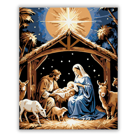 Szent Éjszaka Ragyogása - számfestő készlet – 40×50 cm (Keret nélkül) A képen egy meghitt betlehemi jászol jelenik meg, ahol a szent család körül mennyei fény sugárzik. Az éjszakai égbolt mély kékje csillagokkal van teleszórva, a jelenetet pedig az emelke
