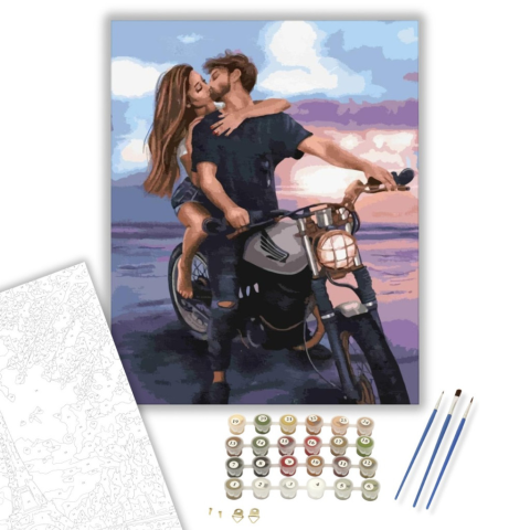 Szerelem a motoron - számfestő készlet – 40×50 cm (Keretre feszítve) Ez a festmény a szabadság és a szenvedély pillanatát ragadja meg, amely azonnal magával ragadja a nézőt. A történet egy romantikus kalandot mesél el, ahol a végtelen út és a naplemente
