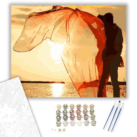 Szerelem a Parton - számfestő készlet – 40×50 cm (Keretre feszítve) A naplemente aranysárga fényei melegséggel töltik meg a festményt, amely egy meghitt pillanatot örökít meg. A kép mesélni kezd egy csendes tengerparti sétáról, ahol a szél játékosan játsz