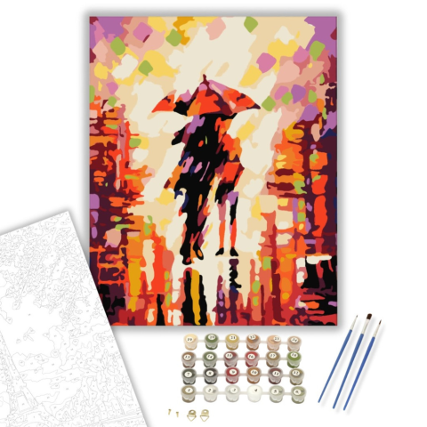 Szerelem Van a Levegőben - számfestő készlet – 40×50 cm (Keretre feszítve) A kép egy esős nap hangulatát idézi, ahol a színek kavalkádja romantikus és melankolikus érzést kelt. A háttérben megbúvó alakok titokzatos történetet mesélnek el, mintha a város n