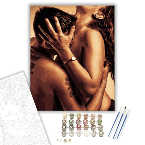 Szerelmes férfi - számfestő készlet – 40×50 cm (Keretre feszítve) A kép meleg tónusai és szenvedélyes jelenete az intimitás mély érzését kelti a nézőben. Egy elragadó pillanat bontakozik ki, ahol a szerelem és a vágy találkozik. Az árnyalatok gazdag kontr
