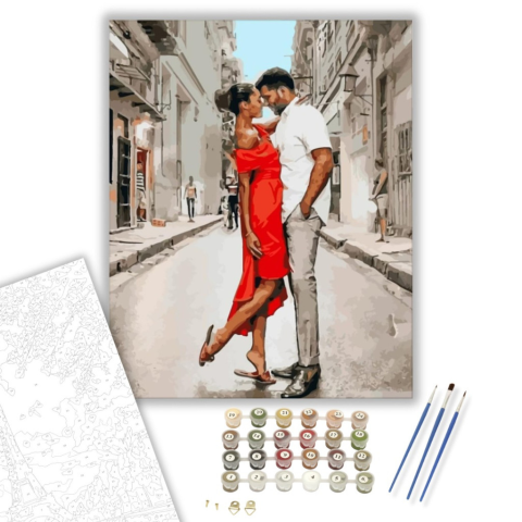 Szerelmes szívek - számfestő készlet – 40×50 cm (Keretre feszítve) A festmény romantikus pillanatot örökít meg egy városi utca forgatagában, ahol a szerelem és intimitás uralja a teret. A kép mesél egy találkozásról, amely tele van szenvedéllyel és élette