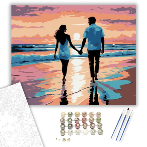 Szerelmespár a Tengerparton Naplementében - számfestő készlet – 40×50 cm (Keretre feszítve) A festmény egy párt ábrázol, amint kéz a kézben sétálnak mezítláb a tengerparton a naplementében. Az égbolt narancssárga és rózsaszín árnyalatai romantikus és béké