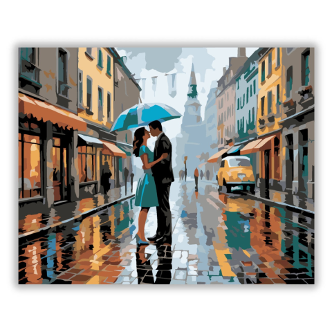 Szerelmespár Esőben, Esernyő Alatt - számfestő készlet – 40×50 cm (Keret nélkül) A festmény egy szerelmespárt ábrázol, amint egy kék esernyő alatt állnak a macskaköves utcán. A színes épületek és a nedves járda tükröződései élénk és romantikus hangulatot