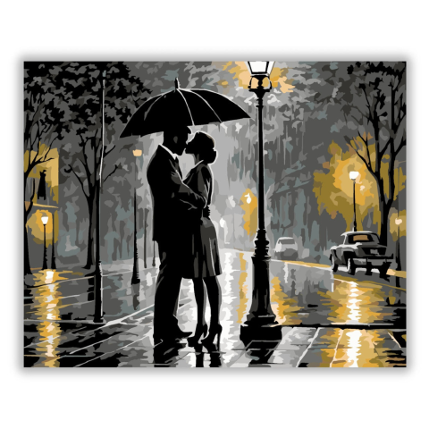 Szerelmespár Esőben Esernyő Alatt - számfestő készlet – 40×50 cm (Keret nélkül) A festmény egy szerelmespárt ábrázol, amint egy esernyő alatt állnak és csókolóznak a lámpafényes utcán, miközben esik az eső. A fekete és szürke árnyalatok, valamint a lámpák