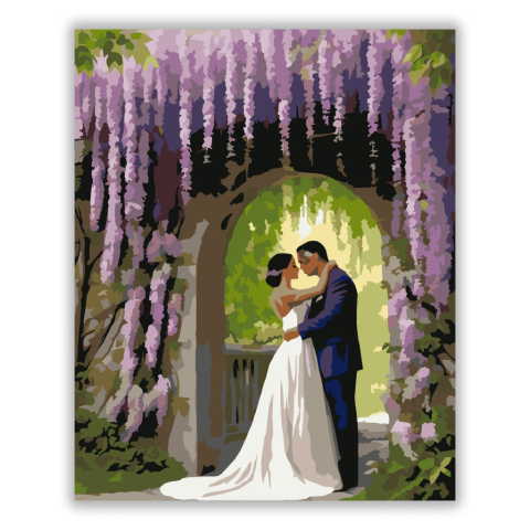 Szerelmespár Lilaakác Alatt - számfestő készlet – 40×50 cm (Keret nélkül) A festmény egy szerelmespárt ábrázol, amint csendes pillanatot osztanak meg egy virágzó lilaakác boltív alatt. A lila virágszirmok lágyan hullanak körülöttük, kiegészítve a kép roma