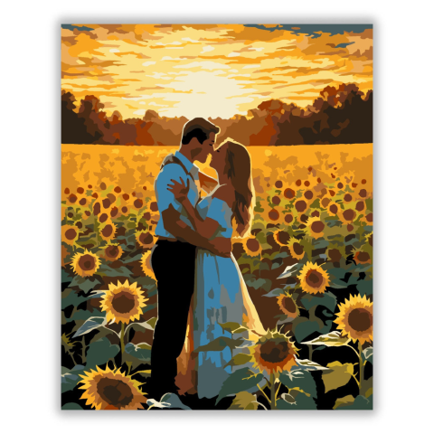 Szerelmespár Napraforgómezőben - számfestő készlet – 40×50 cm (Keret nélkül) A festmény egy szerelmespárt ábrázol, amint napraforgók között ölelkeznek a lenyugvó nap fényében. A meleg arany és narancssárga színek romantikus és meghitt hangulatot teremtene