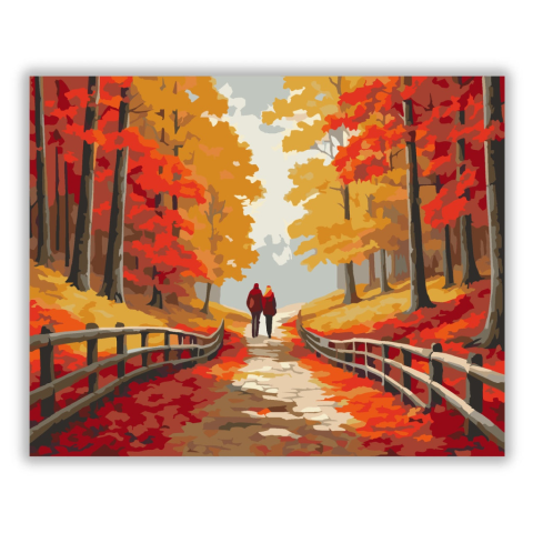 Szerelmespár Őszi Erdőben - számfestő készlet – 40×50 cm (Keret nélkül) A festmény egy párt ábrázol, amint őszi erdei ösvényen sétálnak, körülöttük arany és vörös levelek hullanak. A színek meleg, barátságos hangulatot sugároznak, a sárga és piros árnyala
