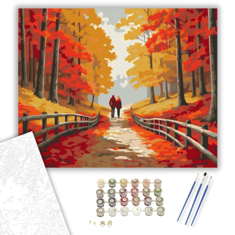 Szerelmespár Őszi Erdőben - számfestő készlet – 40×50 cm (Keretre feszítve) A festmény egy párt ábrázol, amint őszi erdei ösvényen sétálnak, körülöttük arany és vörös levelek hullanak. A színek meleg, barátságos hangulatot sugároznak, a sárga és piros árn