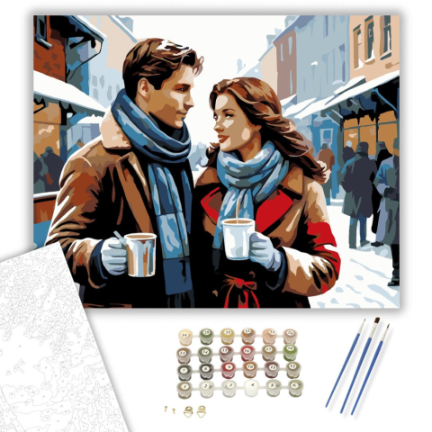 Szerelmespár Téli Vásáron - számfestő készlet – 40×50 cm (Keretre feszítve) A festmény egy fiatal szerelmespárt ábrázol, akik sálakba és kabátokba burkolózva osztoznak egy forró italon egy havas téli vásáron. A jelenetet hideg, kékes és meleg, barnás árny