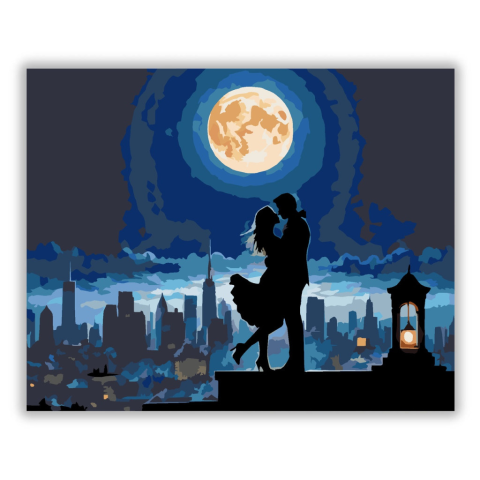 Szerelmespár Telihold Fényében - számfestő készlet – 40×50 cm (Keret nélkül) A festmény egy szerelmespárt ábrázol, akik egy háztetőn állnak, miközben a város fényei és a telihold ragyog mögöttük. A kék és fekete árnyalatok dominálnak, romantikus és miszti