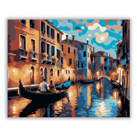 Szerelmespár Velencei Gondolán - számfestő készlet – 40×50 cm (Keret nélkül) A festmény egy szerelmespárt ábrázol, amint egy velencei gondolán ülnek a csendes csatornán. A színek gazdag palettája, az arany, kék és narancs árnyalatai romantikus, álomszerű