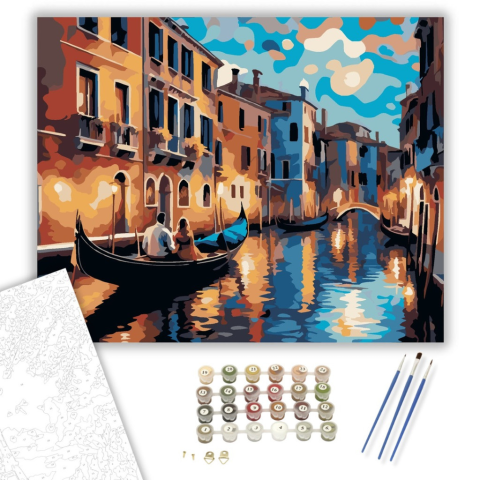 Szerelmespár Velencei Gondolán - számfestő készlet – 40×50 cm (Keretre feszítve) A festmény egy szerelmespárt ábrázol, amint egy velencei gondolán ülnek a csendes csatornán. A színek gazdag palettája, az arany, kék és narancs árnyalatai romantikus, álomsz