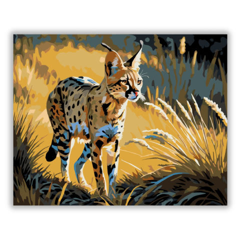 Szervál a Szavannán - számfestő készlet – 40×50 cm (Keret nélkül) A festmény egy szervált ábrázol, amint elegánsan lépked a magas fűben. A kép meleg arany és barna tónusai a napfényes szavanna hangulatát idézik. A kompozíció a vadon élő állat kecsességét