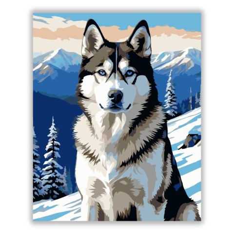 Szibériai Husky a Hegytetőn - számfestő készlet – 40×50 cm (Keret nélkül) A festmény egy impozáns szibériai huskyt ábrázol, amint egy havas hegycsúcson áll. A kép domináns kék és fehér árnyalatai erős, hideg téli hangulatot teremtenek. A husky tekintete a