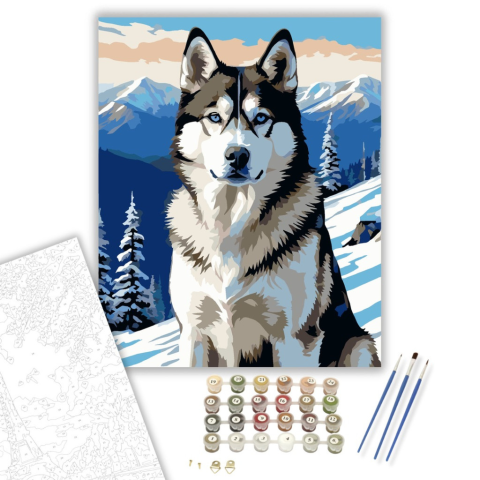 Szibériai Husky a Hegytetőn - számfestő készlet – 40×50 cm (Keretre feszítve) A festmény egy impozáns szibériai huskyt ábrázol, amint egy havas hegycsúcson áll. A kép domináns kék és fehér árnyalatai erős, hideg téli hangulatot teremtenek. A husky tekinte