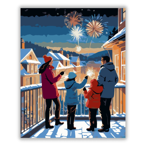 Szilveszteri Családi Ünneplés - számfestő készlet – 40×50 cm (Keret nélkül) A festmény egy családot ábrázol, amint szikrázó csillagszórókkal ünneplik a szilvesztert egy havas erkélyen, miközben a háttérben tűzijáték világítja meg az éjszakai égboltot. A k