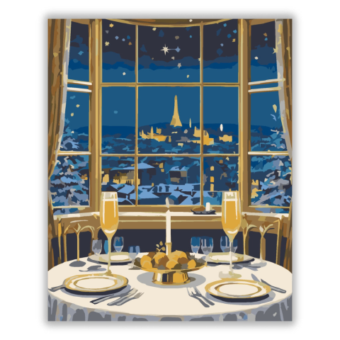 Szilveszteri Vacsora Párizsi Kilátással - számfestő készlet – 40×50 cm (Keret nélkül) A festmény egy hangulatos szilveszteri vacsorát ábrázol Párizs látképével, a háttérben az Eiffel-toronnyal. Az arany és kék színek elegáns és ünnepi hangulatot kölcsönöz