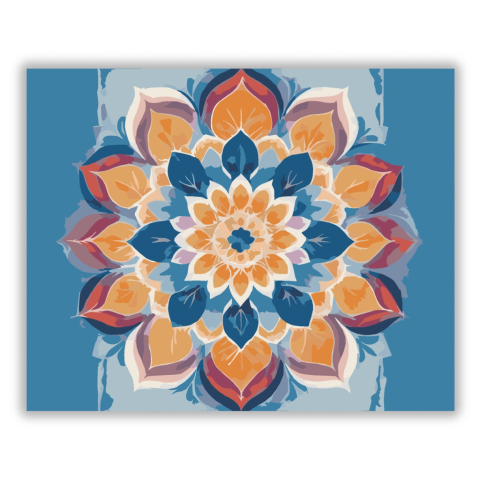 Színátmenetes Mandala Petal Formákkal - számfestő készlet – 40×50 cm (Keret nélkül) A festmény egy részletgazdag mandalát ábrázol, melyet színátmenetes, petal alakú formák díszítenek. Az élénk narancs, kék és lila színek harmonikus keveredése nyugodt, még