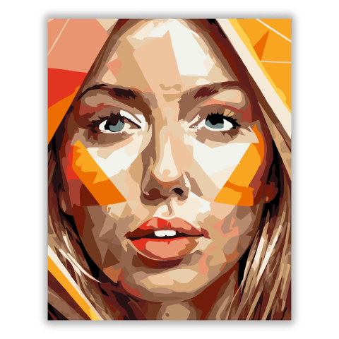 Színes Geometrikus Portré - számfestő készlet – 40×50 cm (Keret nélkül) A festmény egy arcot ábrázol, amelyet színes geometriai formák, például háromszögek és körök alkotnak. A kép élénk narancs, kék és bézs árnyalatokban pompázik, modern és dinamikus han