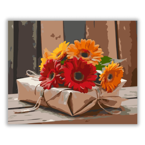 Színes Gerberacsokor - számfestő készlet – 40×50 cm (Keret nélkül) A festmény egy csokor élénk vörös, sárga és narancssárga gerberát ábrázol, rusztikus barna papírba csomagolva, madzaggal átkötve, egy fa padon elhelyezve. A színek kontrasztja és a termész