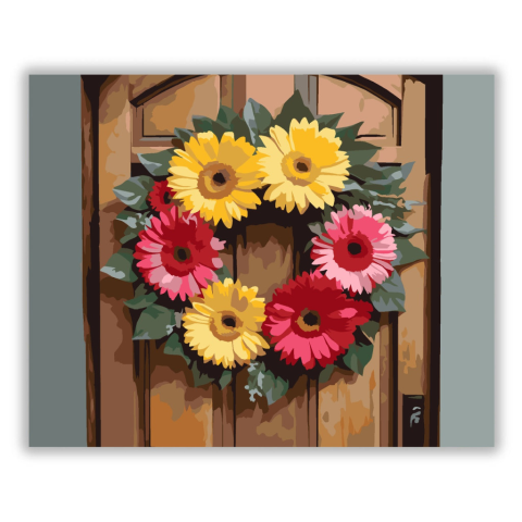 Színes Gerberakoszorú - számfestő készlet – 40×50 cm (Keret nélkül) A festmény egy rusztikus faajtón lógó koszorút ábrázol, melyet pink, sárga és piros gerberák alkotnak. A virágok élénk színei vidám és barátságos hangulatot árasztanak. A kép a vendégek s