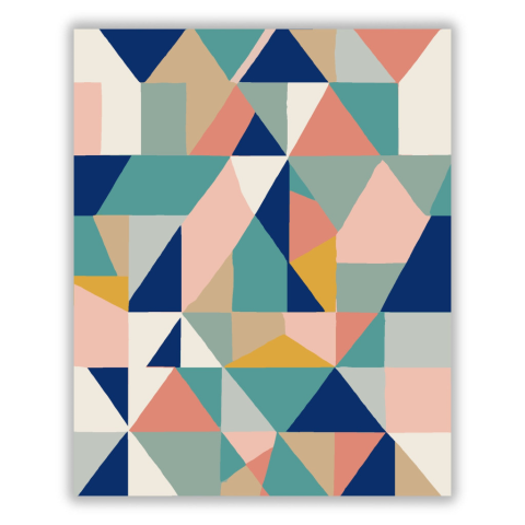Színes Háromszögek és Félkörök - számfestő készlet – 40×50 cm (Keret nélkül) A festmény szabálytalanul elrendezett háromszögekből és félkörökből áll, amelyek rácsos mintában helyezkednek el. A színpaletta tengerészkék, korall, menta és mustár árnyalatokbó