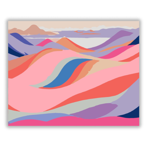 Színes Hullámzó Dombok - számfestő készlet – 40×50 cm (Keret nélkül) A festmény hullámzó dombokat ábrázol, amelyek színes sávokból állnak, mint a fukszia, mandarin, menta, citrom és kobalt. A lágy rózsaszín háttér tovább fokozza a kép vibráló, mégis harmo