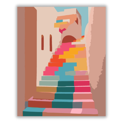 Színes Kocka Lépcső - számfestő készlet – 40×50 cm (Keret nélkül) A festmény egy kockákból és téglalapokból álló, felfelé vezető lépcsőt ábrázol, élénk színekkel. A színek, mint a barack, citrom, fukszia és türkiz, vidám és energikus hangulatot teremtenek