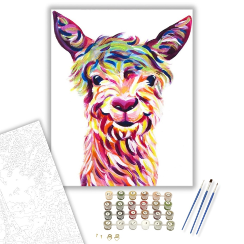 Színes Láma - számfestő készlet – 40×50 cm (Keretre feszítve) A kép élénk színei azonnal magával ragadják a nézőt, egy vidám és játékos világba kalauzolva. Egy történet bontakozik ki, amely tele van derűvel és pozitív energiával. A színkavalkád életre kel