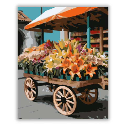 Színes Liliomok Kocsin - számfestő készlet – 40×50 cm (Keret nélkül) A festmény egy rusztikus kocsit ábrázol, amely tele van színes liliomokkal egy virágpiac közepén. Az élénk színű liliomok, mint a narancssárga, sárga, rózsaszín és fehér, egy vidám és pe