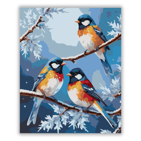 Színes Madarak a Fagyos Ágon - számfestő készlet – 40×50 cm (Keret nélkül) A festmény három színes énekesmadarat ábrázol, akik egy dérlepte ágon pihennek. A hideg kék háttér és a jégkristályok kontrasztot alkotnak a madarak élénk tollazatával. A kép a tél