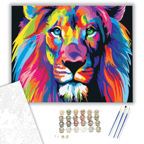 Színes Oroszlán - számfestő készlet – 40×50 cm (Keretre feszítve) Ez a vibráló festmény egy oroszlán színes portréját tárja elénk, amely az erő és szépség harmonikus elegyét sugározza. A színek kavalkádja egy rejtélyes történetet mesél el a vadon királyár