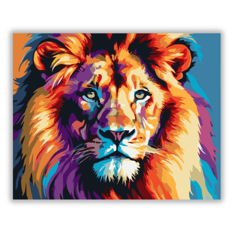 Színes Oroszlán Textúrált Sörénnyel - számfestő készlet – 40×50 cm (Keret nélkül) A festmény egy oroszlánt ábrázol, színes, textúrált sörénnyel, amely narancs, fukszia, aqua és lime árnyalatokból épül fel. A kép élénk színek és kontrasztos árnyalatok komb