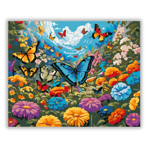 Színes Pillangók Virágos Kertben - számfestő készlet – 40×50 cm (Keret nélkül) A festmény egy élénk virágos kertet ábrázol, ahol különböző fajta pillangók repkednek vidáman. A színpompás virágok között a kék, narancs és sárga szárnyú lepkék jelennek meg,