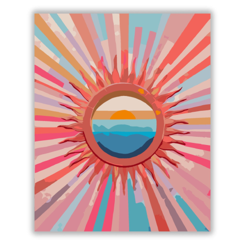 Színes Sugarak és Napkorong - számfestő készlet – 40×50 cm (Keret nélkül) A festmény egy napkorongot ábrázol, amelyet rétegezett színes gyűrűk vesznek körül, mint a narancs, korall, magenta, aqua és égkék. A háttér élénk rózsaszín, amely lágy textúrát ad